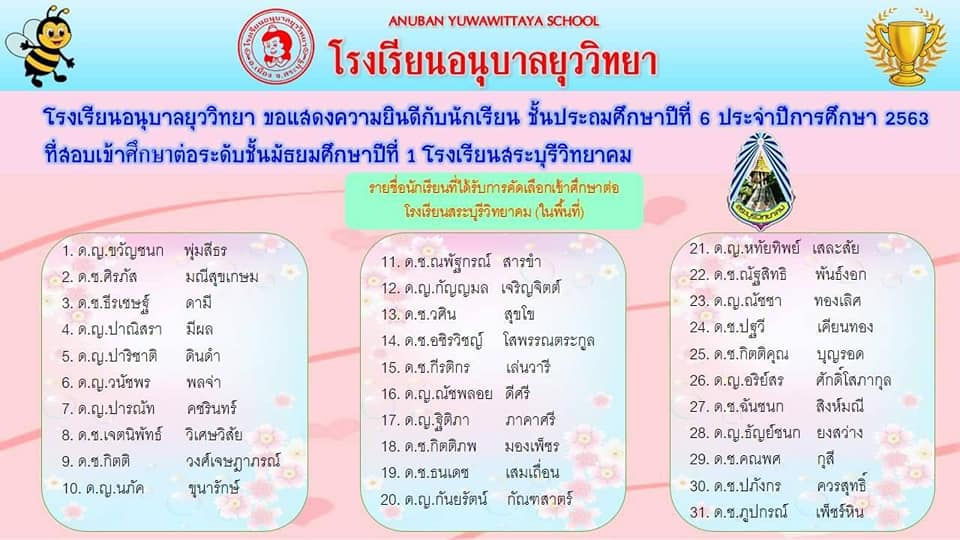 โรงเรียนอนุบาลยุววิทยา ขอแสดงความยินดีแด่นักเรียนที่สอบเข้า มัธยมชั้นปีที่ ๑ ประจำปี ๒๕๖๔Admin22 พ.ค. 2564ยาว 1 นาที โรงเรียนอนุบาลยุววิทยา อำเภอเมือง จังหวัดสระบุรี ขอแสดงความยินดีแด่นักเรียนที่สอบเข้า มัธยมชั้นปีที่ ๑ ประจำปี ๒๕๖๔ ดังนี้